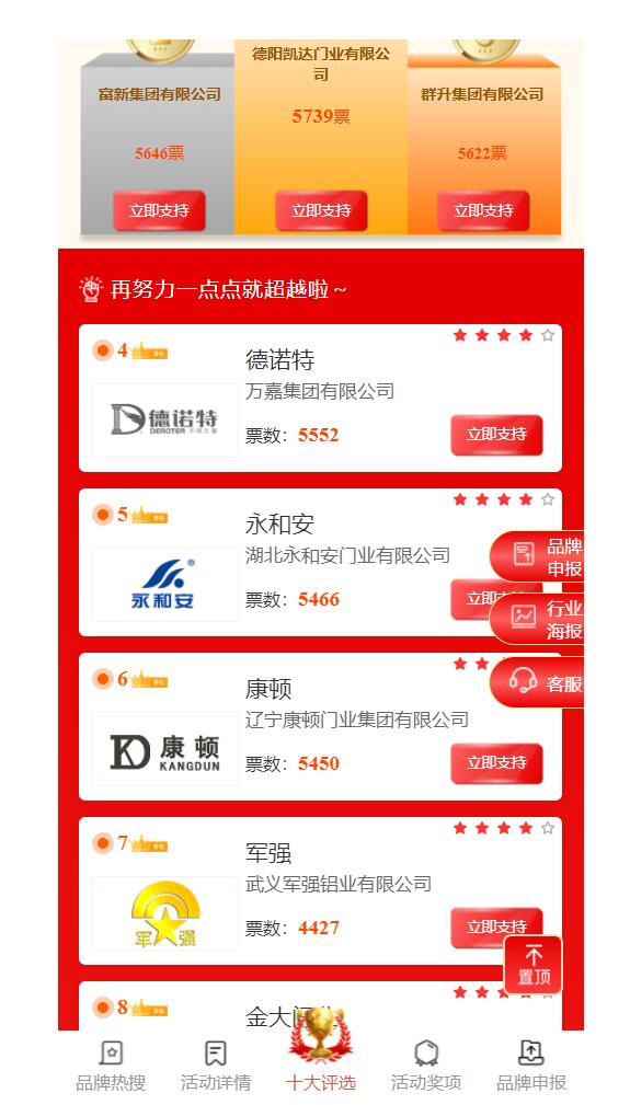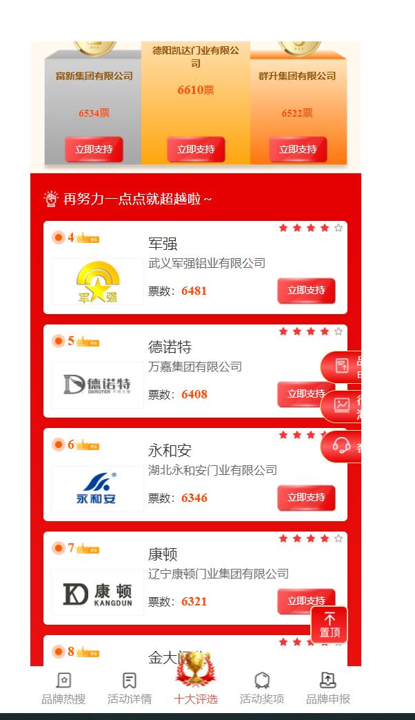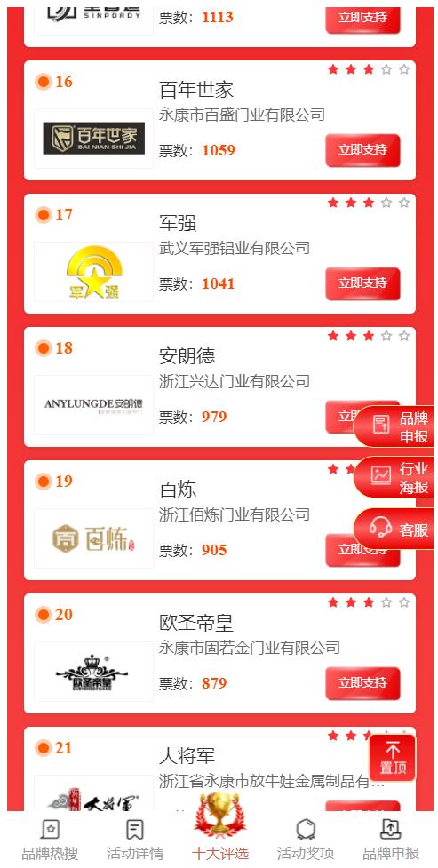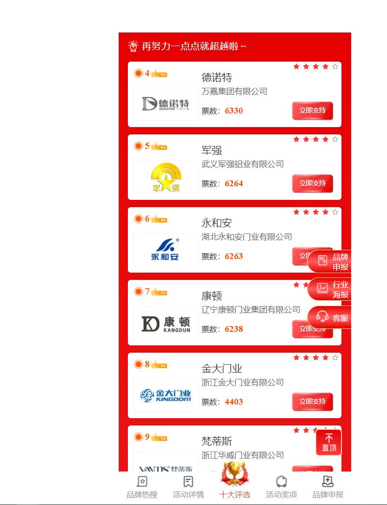 本次網(wǎng)絡(luò)評(píng)選300余家,囊括國(guó)內(nèi)所有中高端鑄鋁門(mén)生產(chǎn)廠家。通過(guò)短短幾天時(shí)間的投票,武義軍強(qiáng)鋁藝有限公司得到網(wǎng)民的廣大認(rèn)可,從第17名快速升到第4名,從而顯現(xiàn)出軍強(qiáng)品牌在社會(huì)的影響力、知名度以及網(wǎng)民的認(rèn)可度。